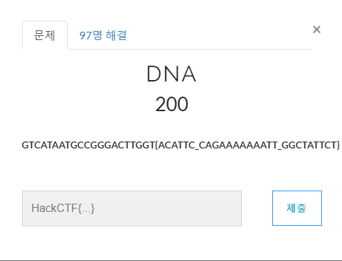 위 표를 참고해서 대칭일테니 앞부분 GTCATAATGCCGGGACTTGGT 이건 HackCTF이고 뒷부분은 적당히 찾아 플래그를 얻으면 된다…