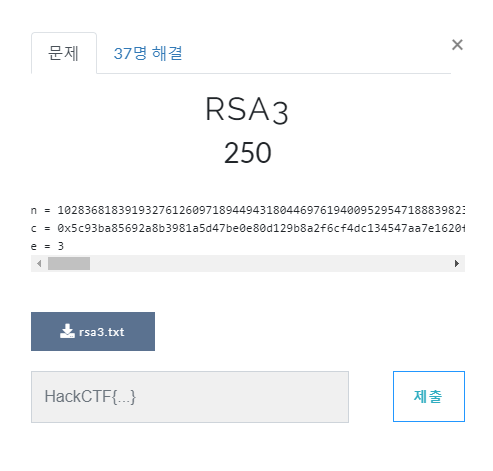 해당 문제는 낮은 지수 공격으로 e 값은 작고 n 값은 매우 큰 경우이다.