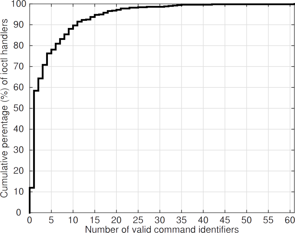 유효한 ioctl 명령어의 추출은 Stanislas 외에 시도되었지만, 최첨단 시스템은 실제 커널 모듈로 확장할 수 없었다. 반대로, 8절에서 보여지듯이, DIFUZE는 실제 장치의 대형 커널 모듈로 확장하고 취약점을 찾아낸다.