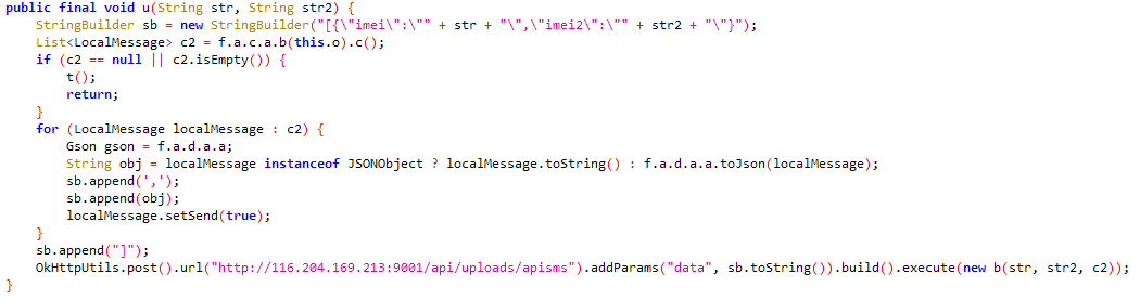 해당 데이터는 안드로이드 단말기에 저장된 연락처, 이미지, 메세지, 통화기록을 가져와 API 서버로 전달되는 점을 알 수 있다.