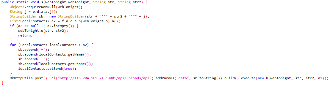 APK 파일을 살펴보면, 중국 도메인 서버를 두고 있는 API 주소(116.204.169.213)를 찾을 수 있다.